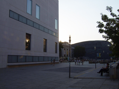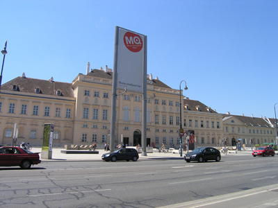 美術史美術館と自然史博物館に挟まれたマリア・テレジア像が建つ庭園を抜けて反対側の通りを渡ると、複数の美術館や文化施設を集めた地区、ミュージアム・クォーターがあります。2001年にオープンしたんだそう。