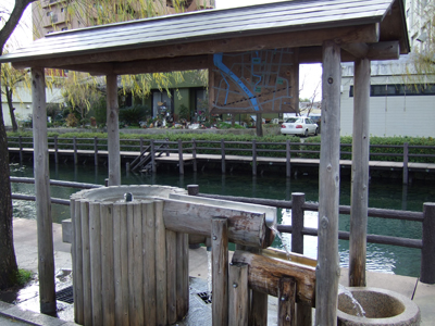 「うちぬき」の湧き水を直接取るところがあって、大きなポリ容器でこの水を取りにくる人もいるようです。