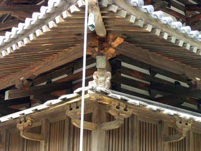 五重塔というと、黒っぽい感じがしますが、ここまで近づくと、元々は朱色に塗られていたことがわかります。緑青で変色した金属飾りは、おそらく金色か銅色。頭の中で建てられたばかりの時をシミュレーションをすると…、我々の知る古雅な姿ではなく、どきついばかりの最新式の大建築があらわれます。