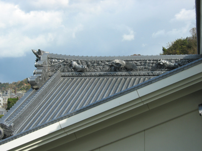 ということで、降りる道すがらふと見ると、さすが、「かわら館」の屋根。遠くから見ている時は気がつきませんでしたが、えらく凝っています。