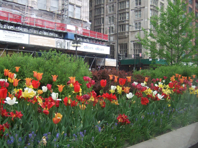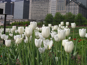 それでも摩天楼下で咲き乱れる白いチューリップは憩いの場。