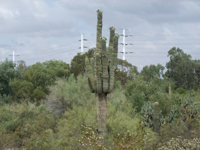 荒れ野にそそりたつサボテン。向こうの電柱ともあいまって不思議な光景です。